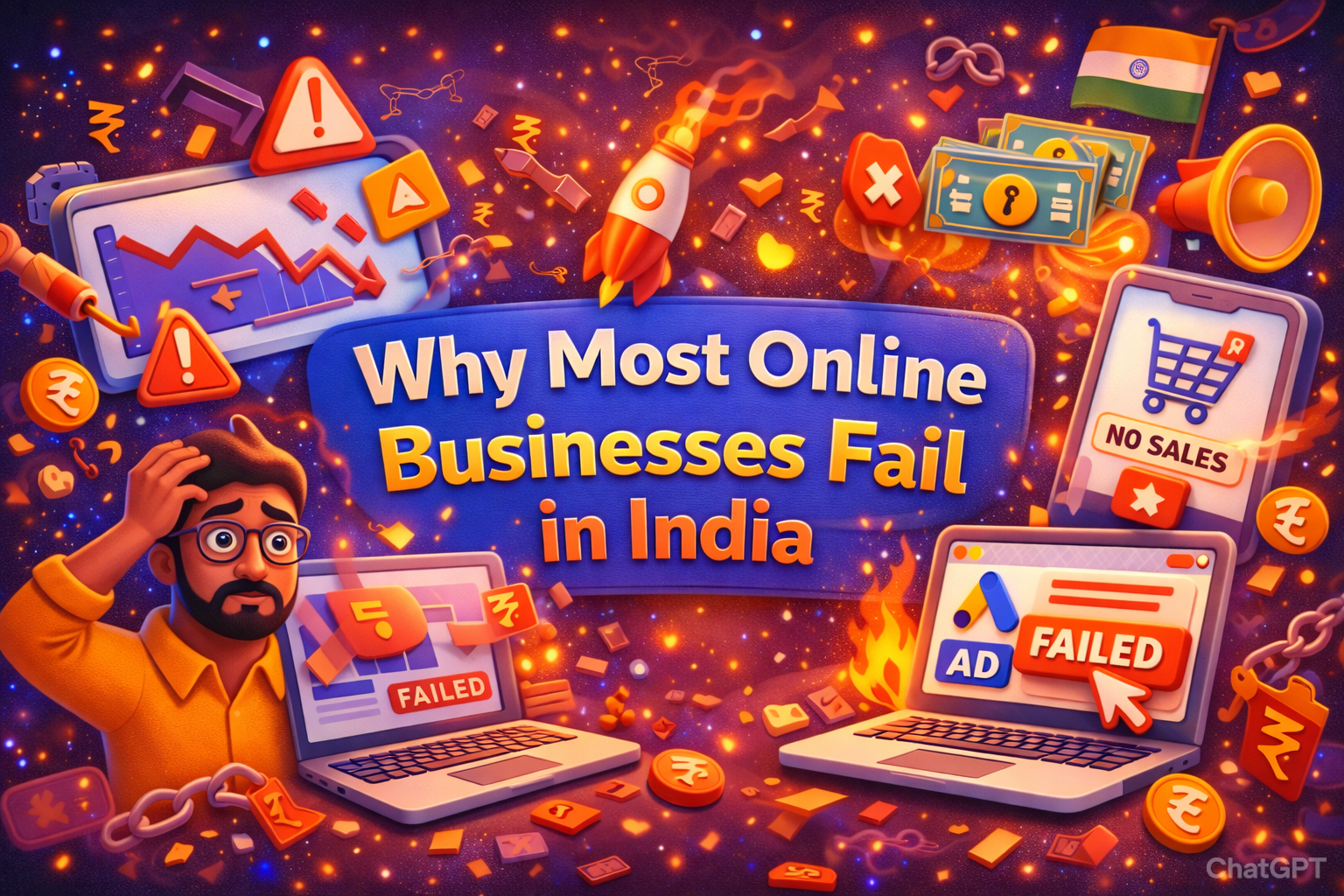 Most online businesses in India fail due to poor market research, weak digital marketing strategies, lack of customer trust, financial mismanagement, and unrealistic expectations of quick success.